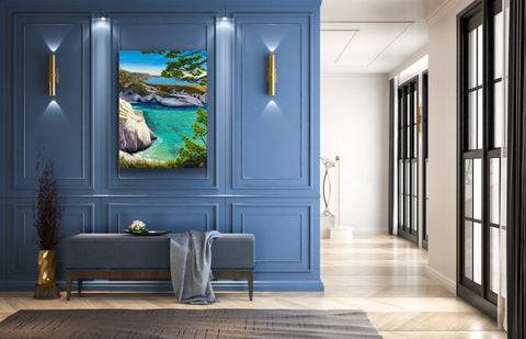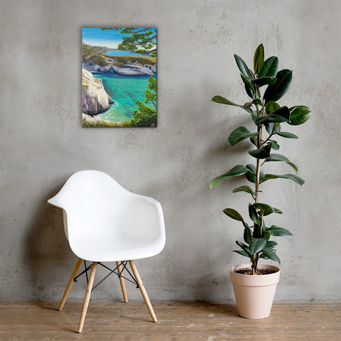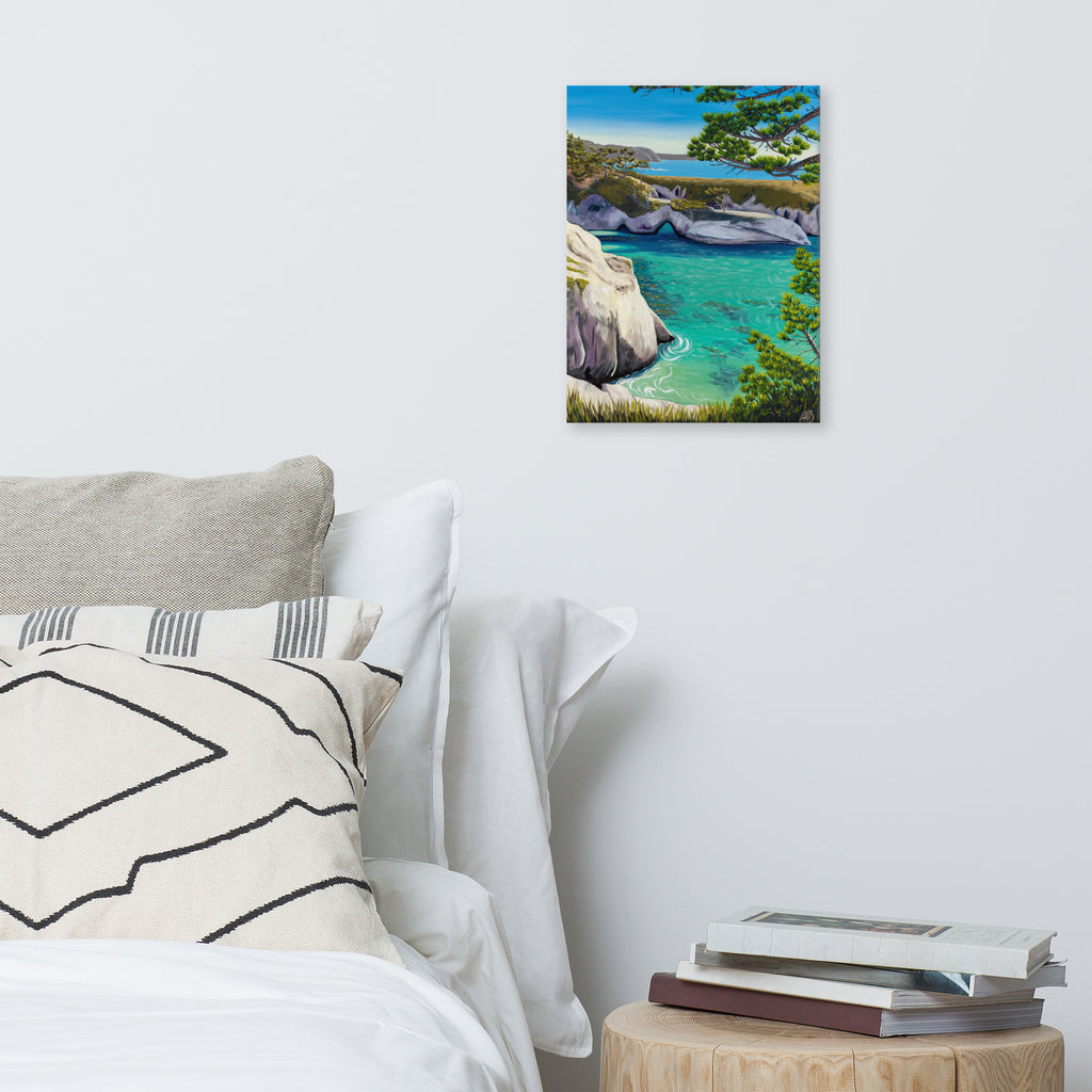 “China Cove” invites you into a space where nature’s textures and colors come alive with refreshing clarity. Crisp white cliffs rise confidently at the forefront, their surfaces catching light and shadow in a way that almost lets you feel the roughness beneath your fingertips. The cove’s turquoise waters swirl gently around these rocky edges, shifting in tone as currents weave through the scene, giving a dynamic flow to an otherwise tranquil spot. Pine branches reach in from the sides, adding bursts of lively green that frame the view without crowding it. Beyond the water, more rocky outcrops peppered with grasses and small trees offer a sense of depth and quiet invitation, while the clear blue sky overhead expands the space with effortless calm. This landscape captures the subtle interplay between solid ground, fluid water, and living foliage—each element distinct yet harmoniously connected in a peaceful coastal embrace.