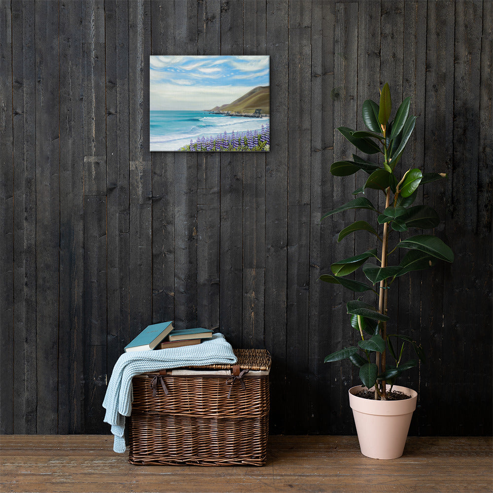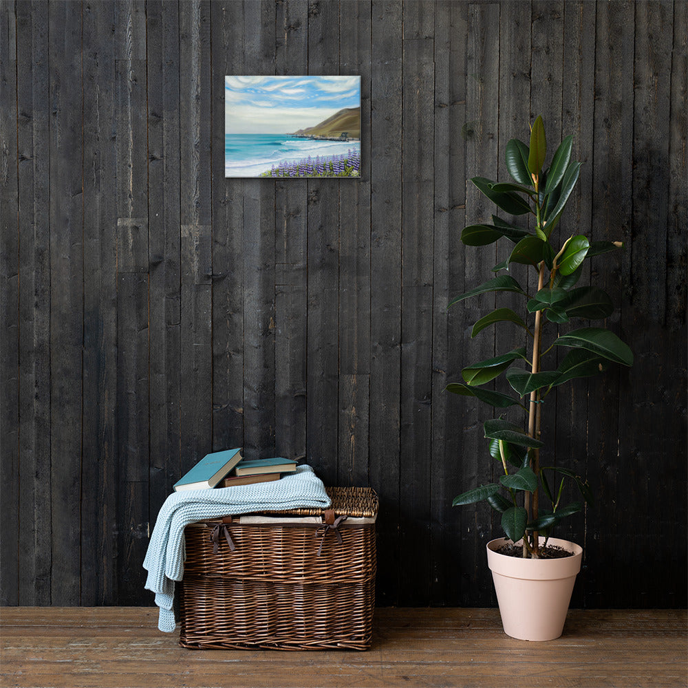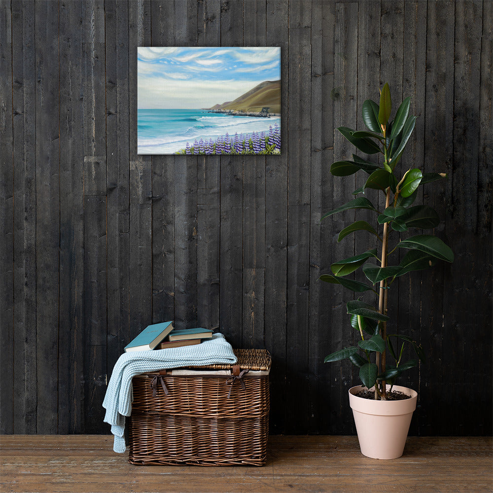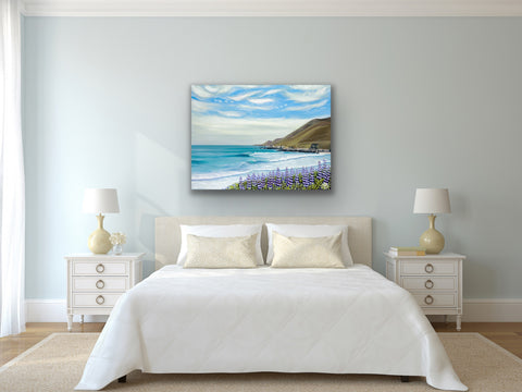 “Garrapata” invites you to a quiet moment where coastal calm meets natural vibrancy. The scene unfolds with powerful waves rolling in to a sandy shore, their movement steady but unhurried, drawing the eye toward a distant, open ocean painted in a gradient of turquoise and deep blues. A cluster of purple lupines claims the foreground, their lively hue and fresh green leaves offering a crisp contrast that enlivens the composition without overwhelming it. To the right, softly rolling hills lead the eye toward rocky outcrops that edge the water, adding texture and a sense of groundedness. Above, a sky of delicate, wispy clouds drifts across a soothing blue expanse, completing a landscape that feels both expansive and intimately serene. This piece captures the understated beauty of a coastal day where the elements work together with quiet balance and natural grace.