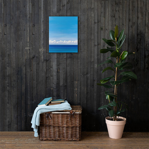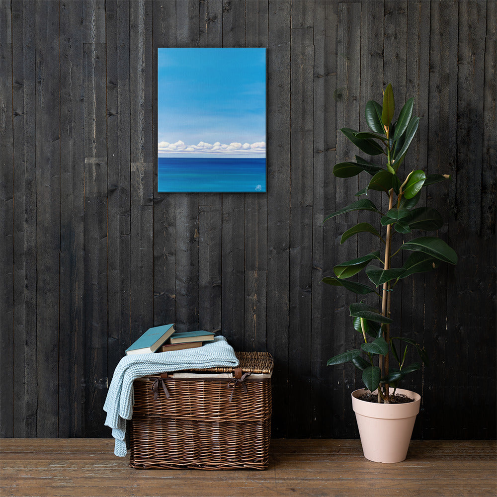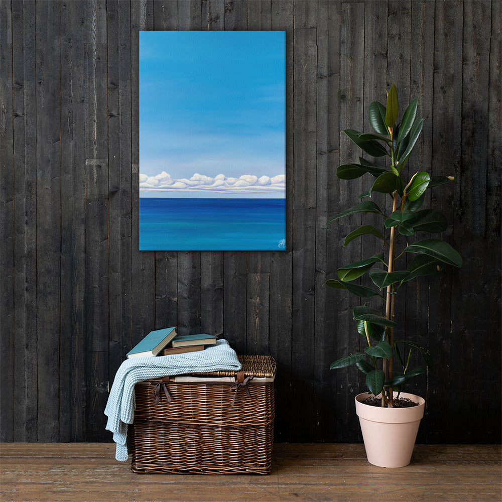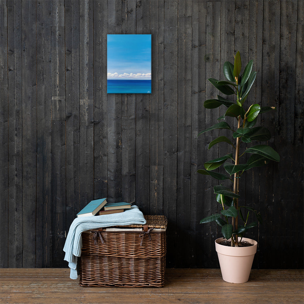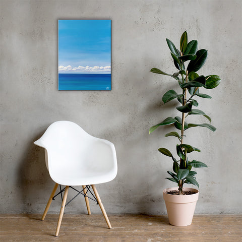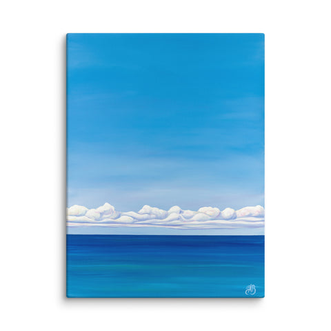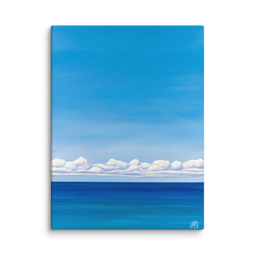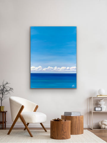 “Horizon” invites you to pause and breathe in a quiet moment where sky and sea meet with unspoken ease. The canvas is filled mostly with an expansive blue sky, its calm tone stretching wide and open, giving space to the mind to wander. Just above the horizon, a neat line of soft, white clouds gently hovers, adding a touch of lightness and subtle texture without disrupting the calmness. Below, the ocean sits serenely, its deep blues layered with gentle shifts that hint at movement beneath the surface. The simplicity of this scene draws attention to the delicate balance between elements, creating a feeling of tranquility that’s both soothing and quietly invigorating. It’s a snapshot of nature’s effortless harmony—a reminder of how something straightforward can feel profoundly renewing.