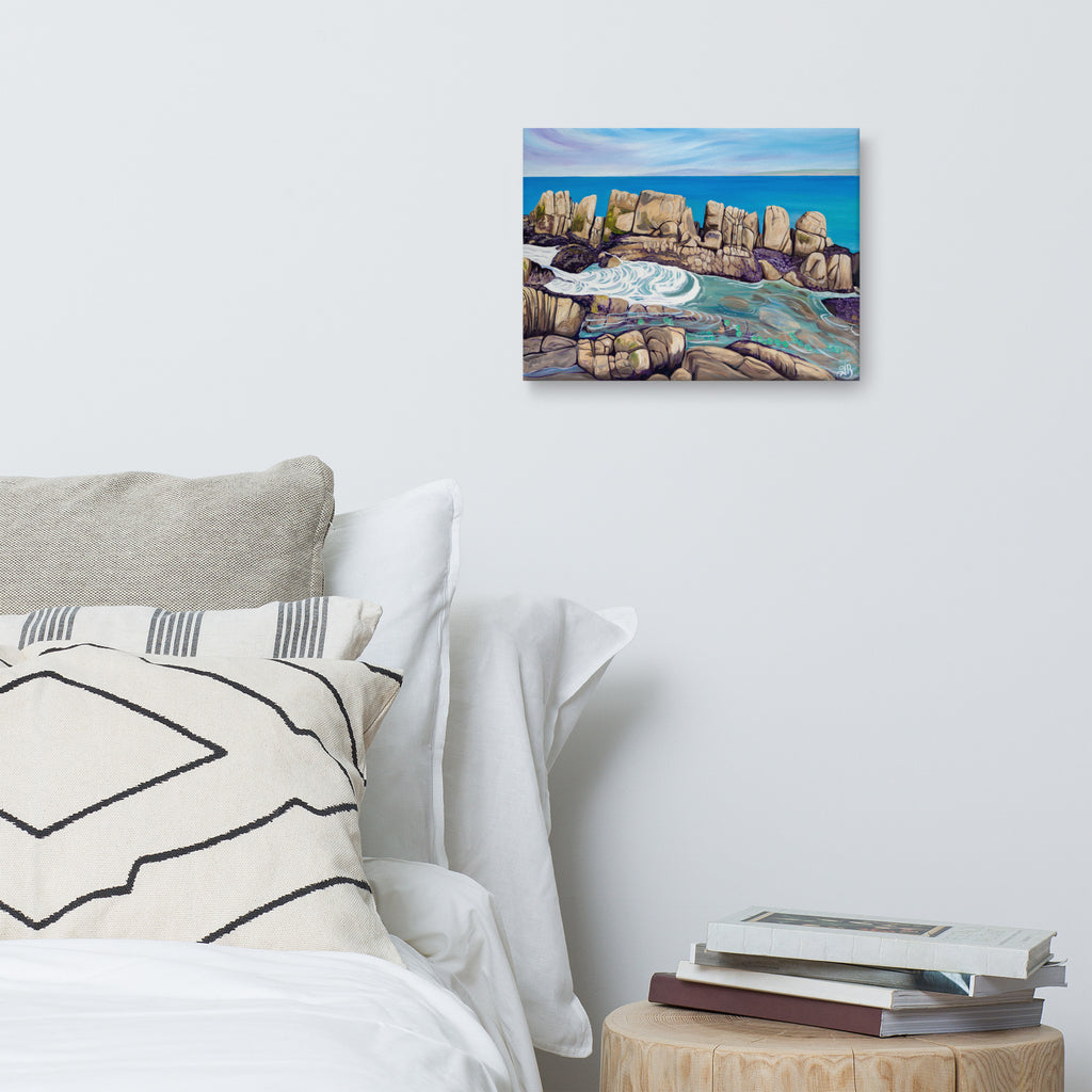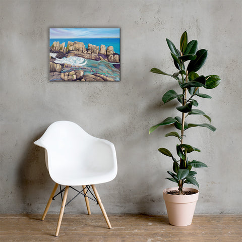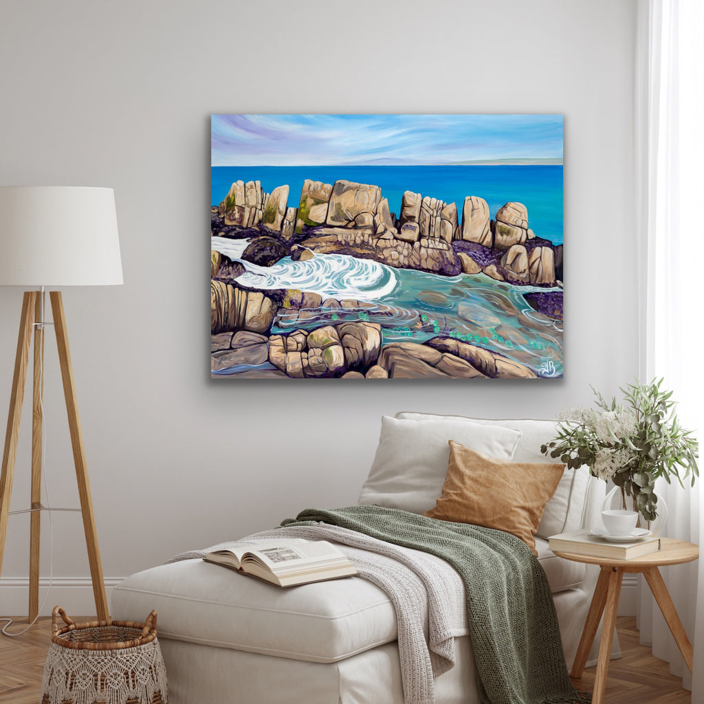 “Lover’s Point” captures a lively coastal moment where rugged rocks meet the active sea in a vibrant dance of color and texture. The warm, earthy tones of the rock formations provide a rich contrast to the cool blues and turquoises of the ocean, creating a harmonious interplay of land and water. Details like the algae and mussels clinging to the stone and the foamy white waves actively breaking over the pool lend a tactile quality that invites closer inspection. Above, the sky shifts subtly from soft purples to blues, hinting at a quiet calm that balances the animated movement below. The composition lives in the tension between energy and serenity, inviting viewers to feel the ebb and flow of this intimate coastal scene as if stepping right into the tide pool’s sheltered embrace.