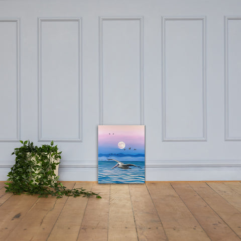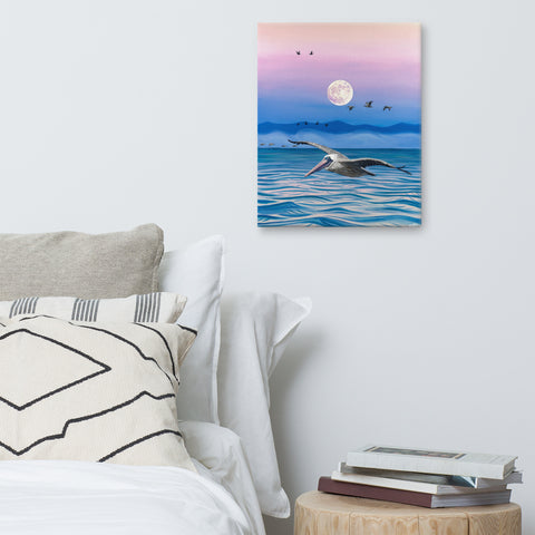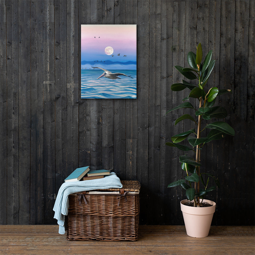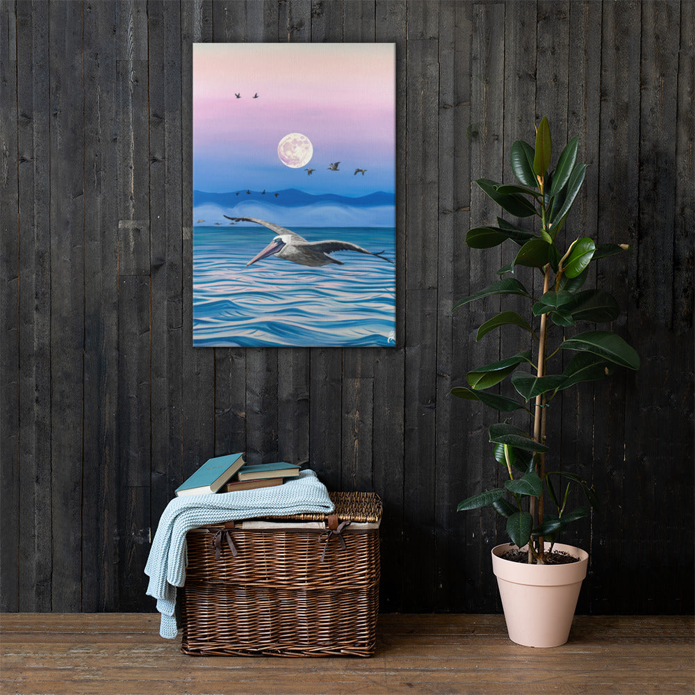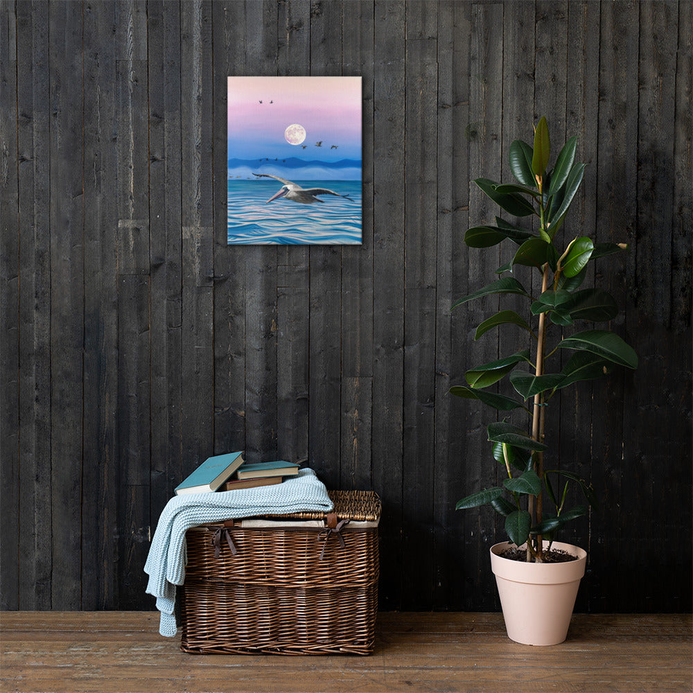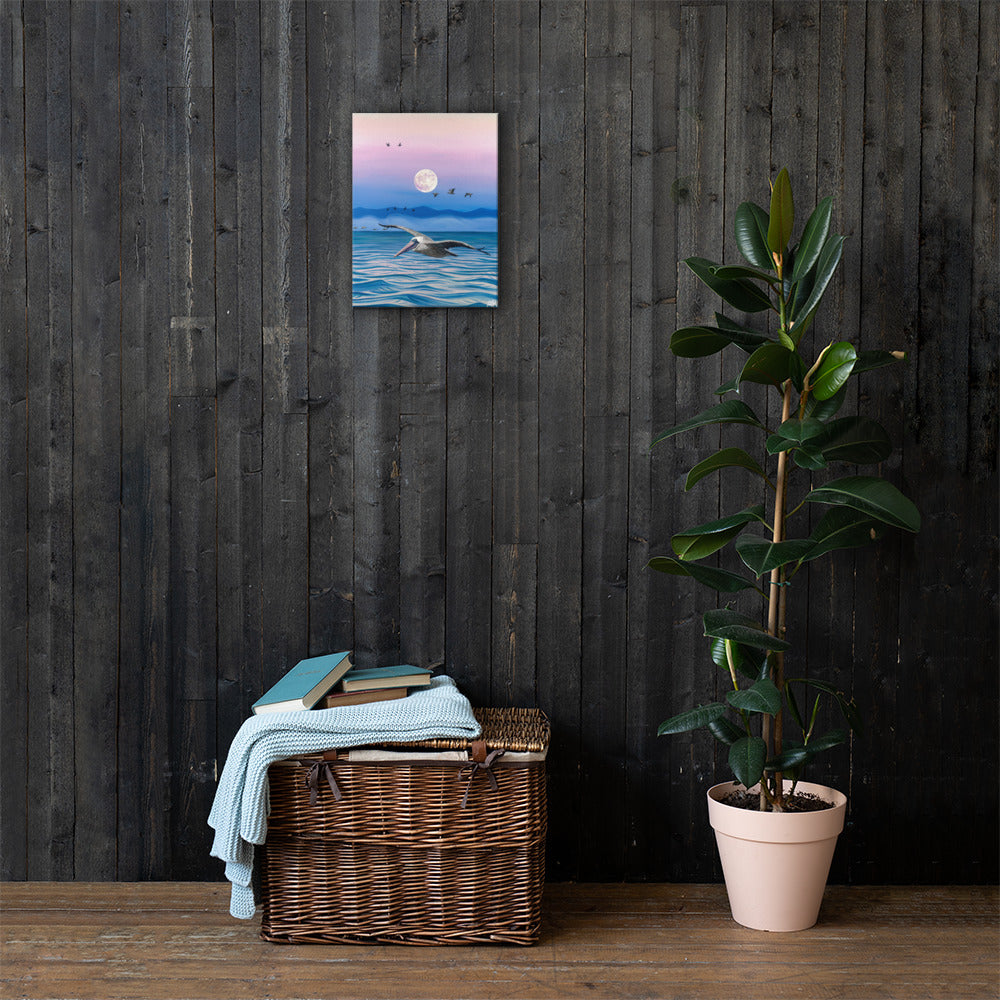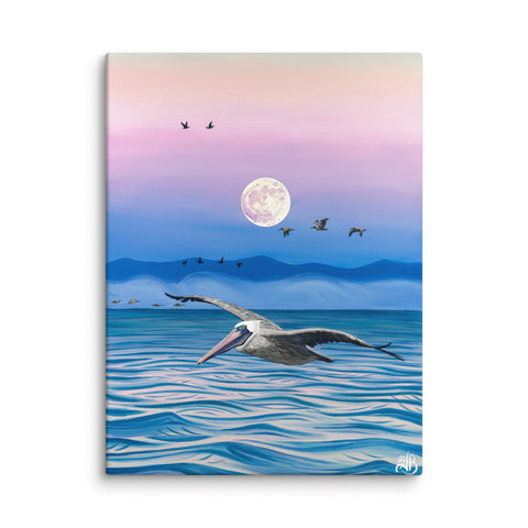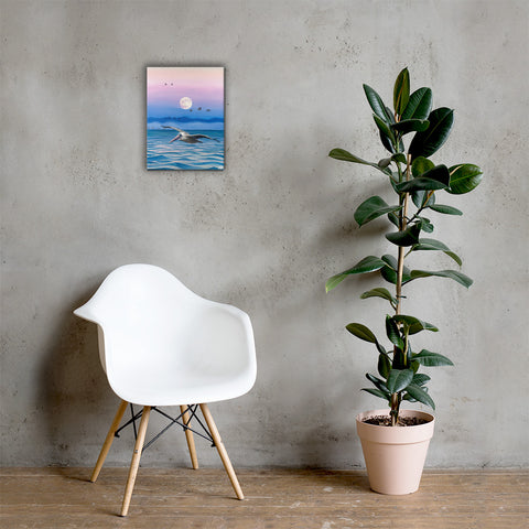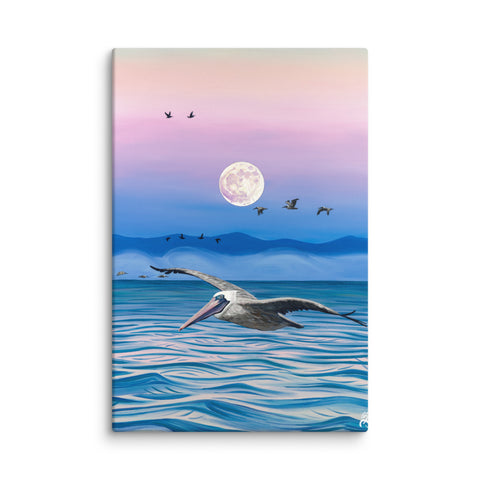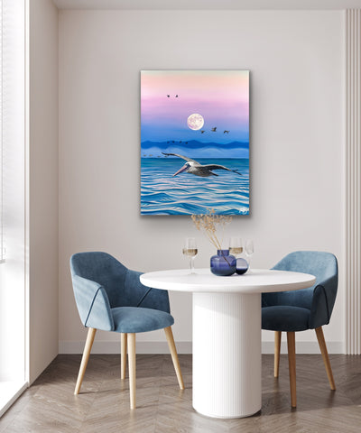 "Pelican Drift” captures a quiet moment where nature’s rhythm and the fading light meet in easy harmony. The sky shifts delicately from soft pinks to cool blues, setting a gentle, almost whispered tone as dusk settles in. Dominating the scene, a pelican glides just above the water’s surface, wings stretched wide in effortless motion, embodying both grace and curiosity. Around it, other birds trace subtle paths against the silhouette of distant mountains, their flight steady and composed. Below, the water responds with a dance of waves rendered in layered blues, suggesting a sea that’s alive but at peace. This scene invites you to linger in the balance between day and night, water and sky, stillness and movement—an invitation to appreciate the quiet elegance found in a single, fleeting moment.