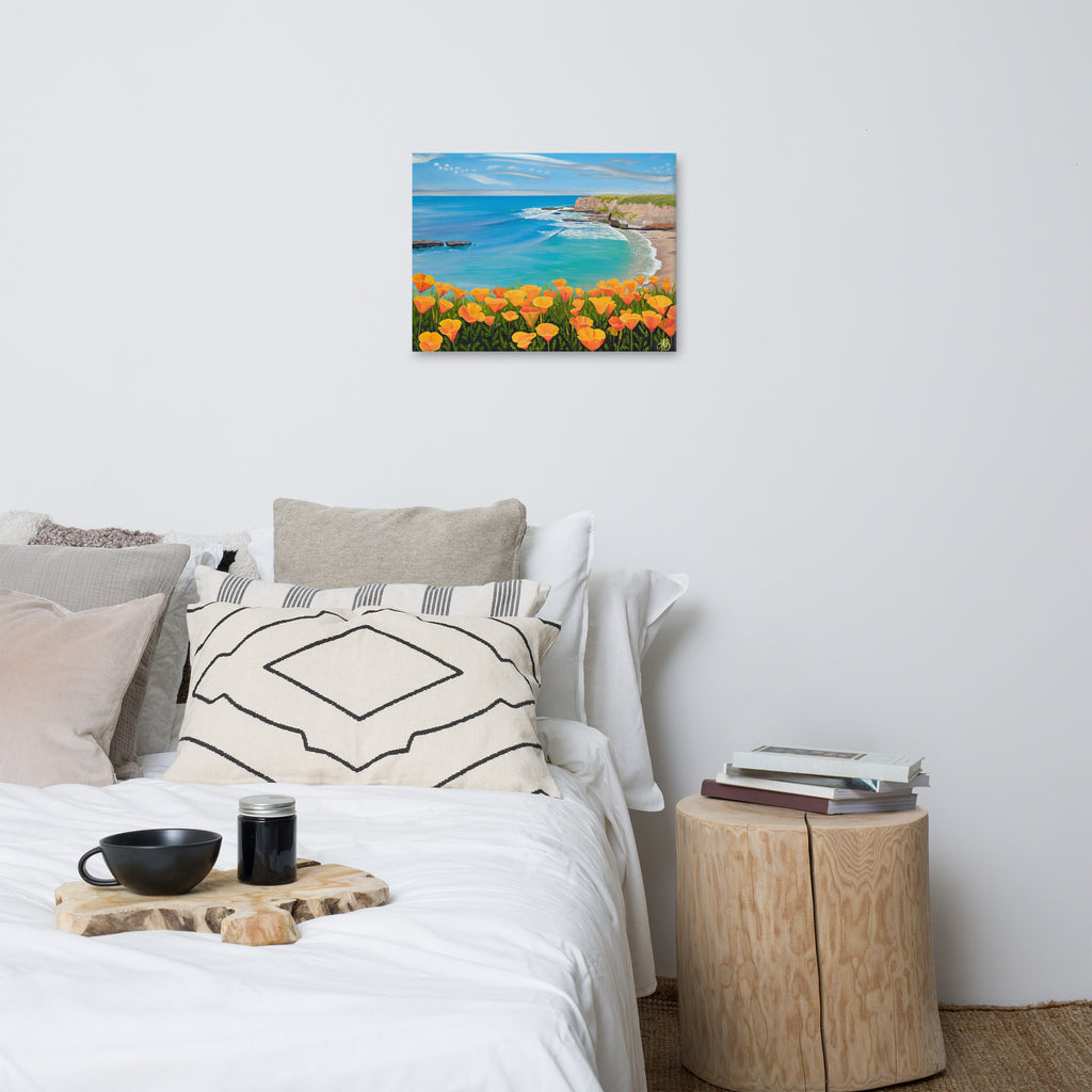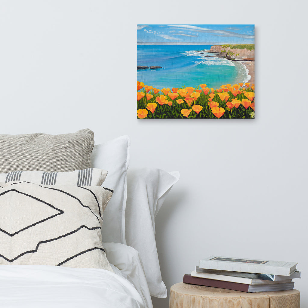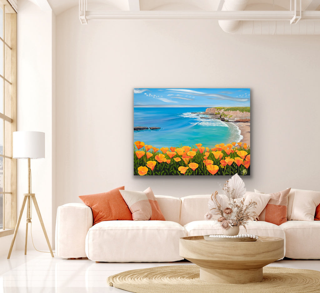 Bursting with cheerful energy, this scene invites you to step into a hidden coastal cove where nature’s brightness takes center stage. A lively cluster of orange and yellow California poppies spills across the foreground, their bold petals catching the light as if celebrating an endless summer day. Beyond the flowers, a calm turquoise ocean stretches out, its gentle waves quietly embracing the rocky reef. To the right, rugged cliffs rise with textured patches of greenery, adding a grounded contrast to the otherwise airy landscape. Overhead, a bright blue sky dotted with light clouds completes this sun-drenched vista, suggesting warmth and quiet joy. With smooth brushwork and vivid colors, the composition feels both vibrant and inviting, encouraging a moment of effortless escape.