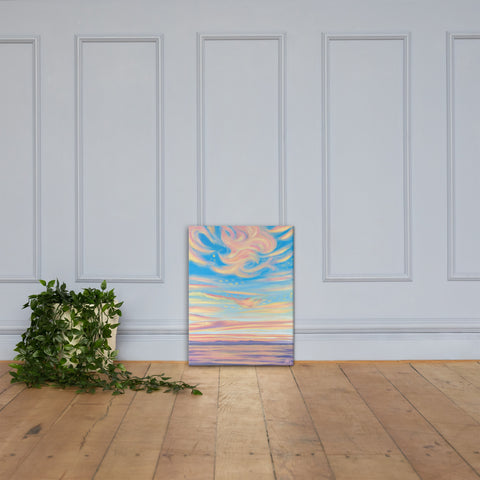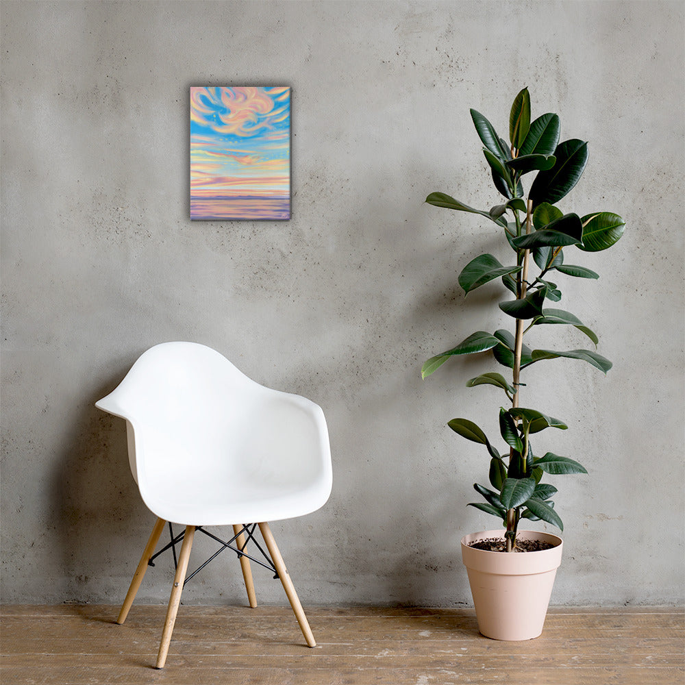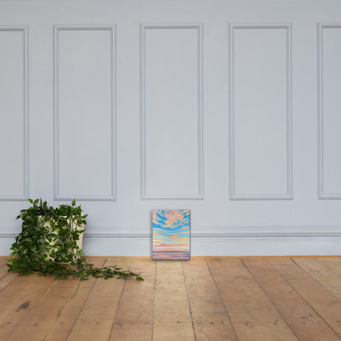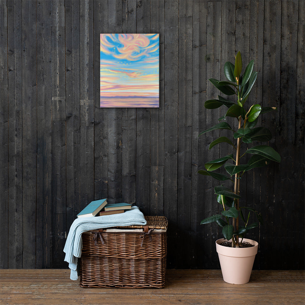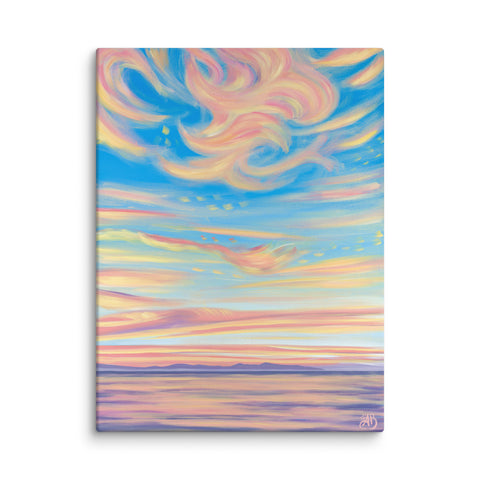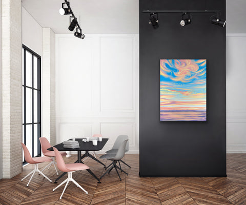 “Sunset on the Bay” captures the quiet magic of day’s end with a fresh and vibrant energy. The sky is a dance of pastel clouds, swirling in soft pinks, oranges, and buttery yellows that seem to pulse gently against a calm blue backdrop. Below, the water mirrors this gentle spectacle, its surface brushed with warm reflections that ripple with subtle movement. Muted mountain silhouettes rest peacefully along the horizon, anchoring the scene with a quiet depth. The composition invites a moment of calm observation, where the play of light and color conveys both the serenity and the subtle liveliness of the twilight hour. It’s an artwork that balances stillness and softness, offering a thoughtful glimpse into the fleeting beauty of a sunset’s embrace.